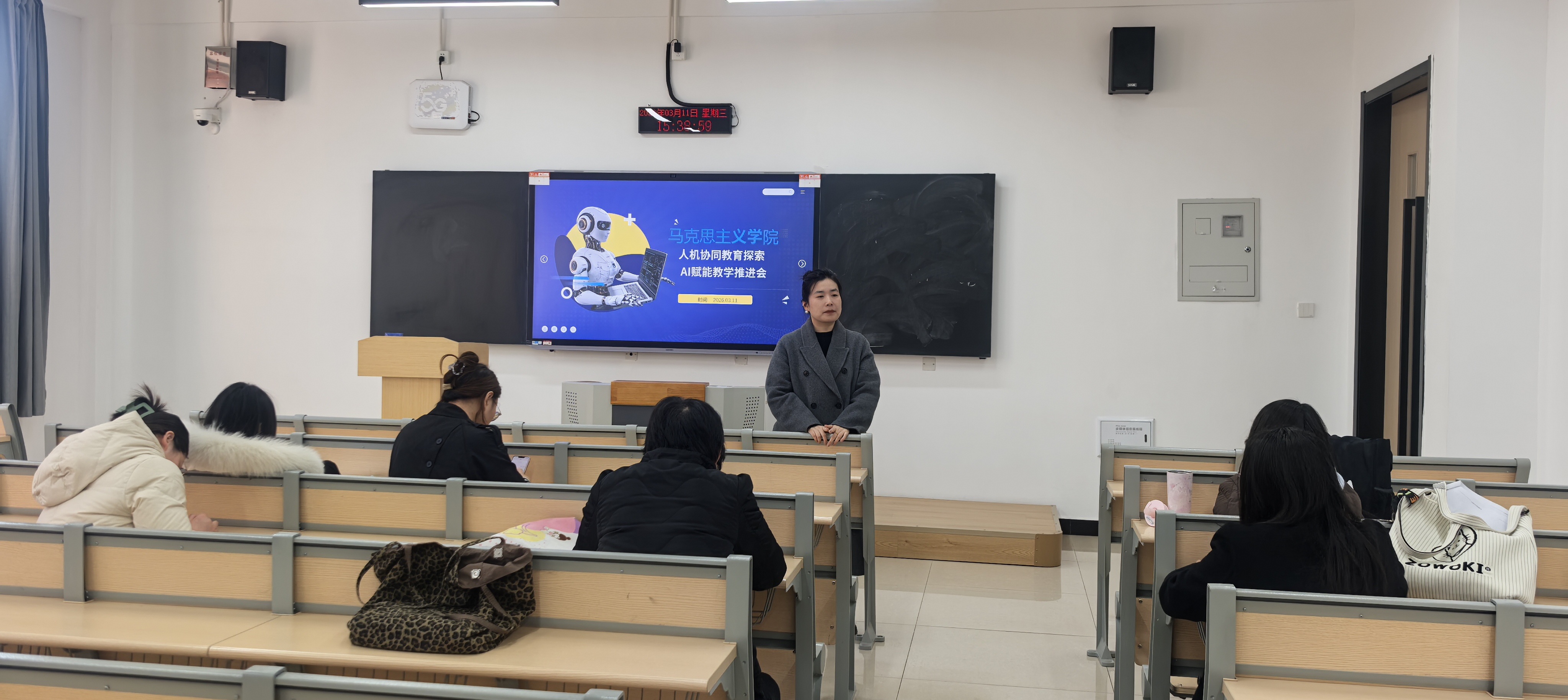 为深入推进教育数字化转型,创新思政课教学模式,提升课堂吸引力与实效性,3月11日,马克思主义学院在K1-504召开AI赋能教学暨人机协同教育探索推进会。会议由学院AI赋能教学科研团队负责人侯薇老师主持,团队全体教师参会,共同探索AI技术与思政课教学深度融合的实施路径。